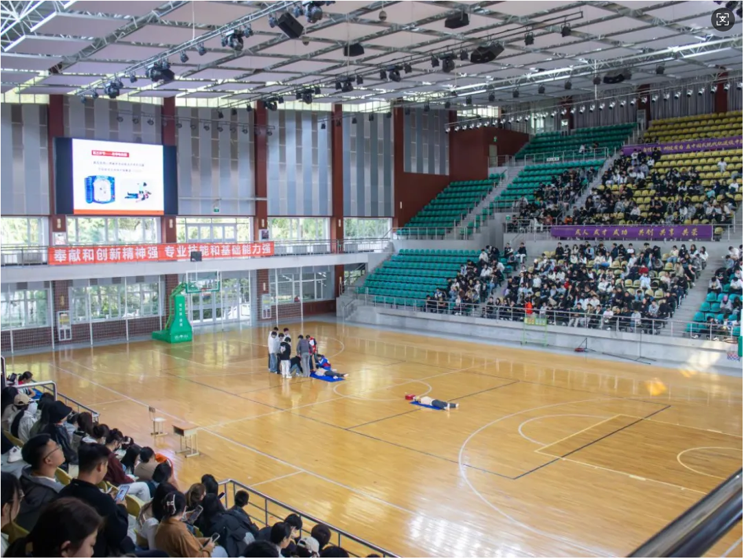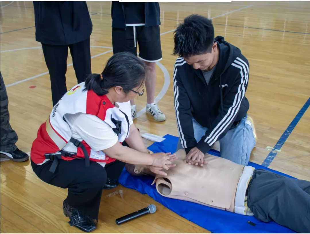 张春英重点从中国红十字的主要工作、心肺复苏(CPR)概述及程序、自动体外除颤器(AED)原理及用法三方面进行讲授。同时,结合案例数据、点位讲解和医疗术语,为师生带来一堂实用、专业的急救技能培训课。