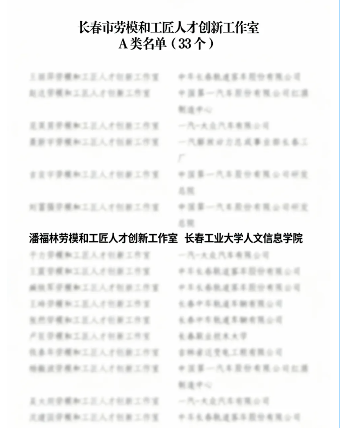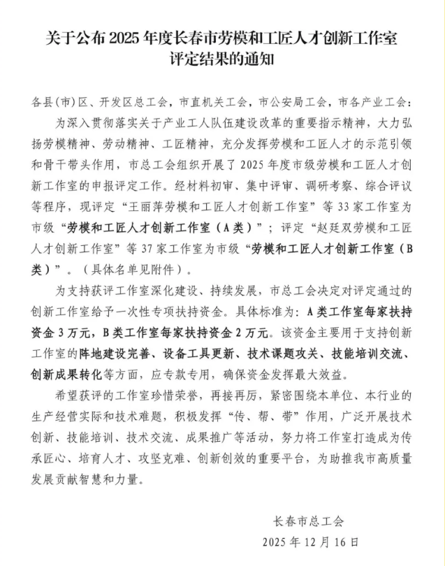 此次市级创新工作室评定工作由长春市总工会牵头组织,经过材料初审、集中评审、调研考察、综合评议等程序,最终确定33家工作室为市级“劳模和工匠人才创新工作室(A类)”;37家工作室为市级“劳模和工匠人才创新工作室(B类)”。